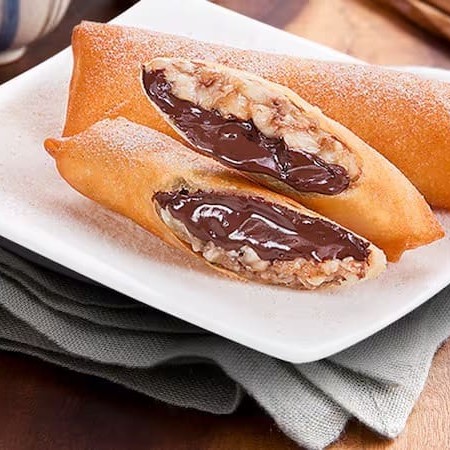 Fatias de banana e chocolate ao leite envoltos em uma massa fina e crocante, finalizados com uma camada de açúcar e canela. Uma sobremesa deliciosa que combina a doçura da banana com o sabor rico do chocolate e a crocância irresistível.