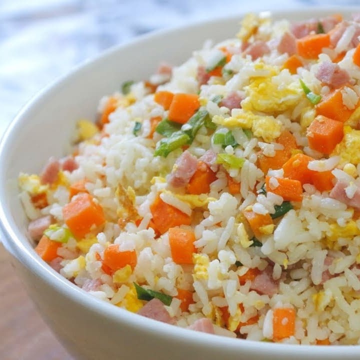 Arroz com flocos de ovos, cenoura, presunto delicioso e cebolinha picada.