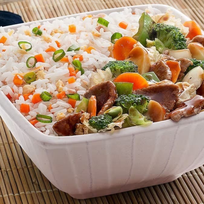 Carne em tiras suculenta com legumes (brócolis, cenoura, couve-flor, acelga, champignon e alho) temperados com molho de soja. Prato executivo acompanha metade do box com prato escolhido e metade Yakimeshi (arroz com flocos de ovos, cenoura, presunto e cebolinha).
