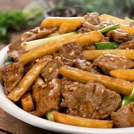 Carne em tiras suculenta com batatas fritas temperadas com molho oriental, gengibre e alho.