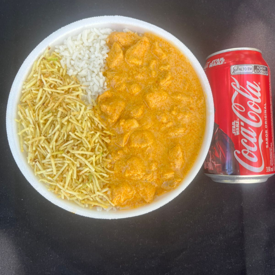 Strogonoff de Frango + Palha + Arroz e Feijao + Cola Cola 350 ML