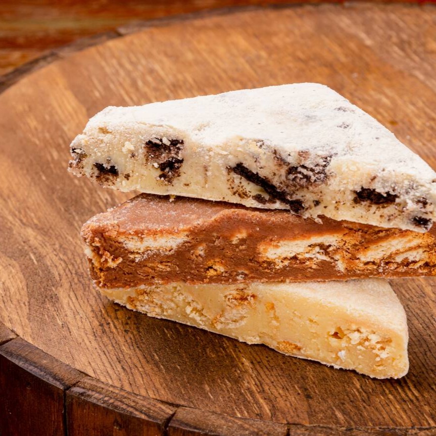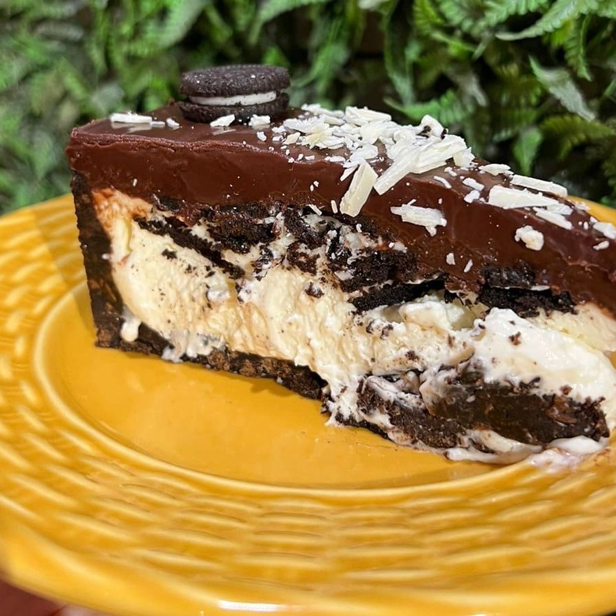 Base Negresco, creme leve branco com Oreo e ganache de chocolate e raspas de chocolate branco.