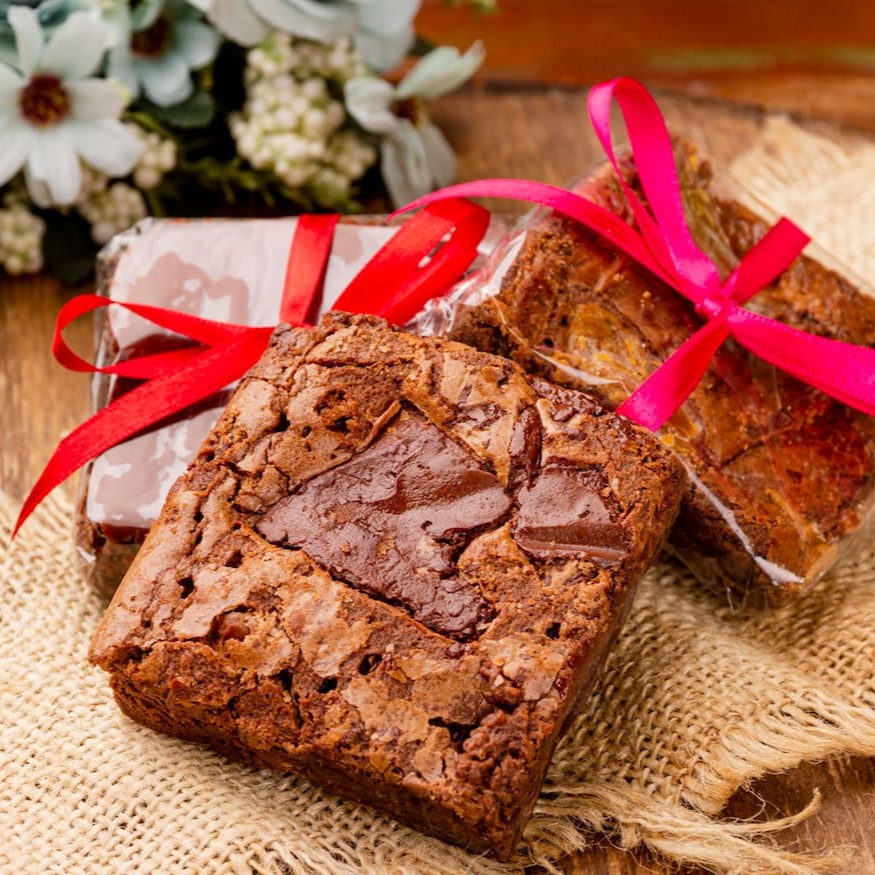 Brownie da casa assado com pedaços de doce de leite cremoso.