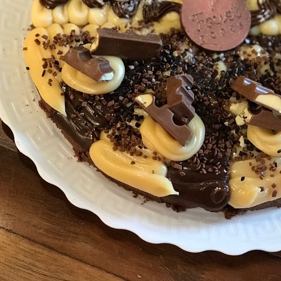 Fatia de pizza brownie, nosso delicioso brownie da casa coberto com brigadeiro e brigadeiro branco com Kinder