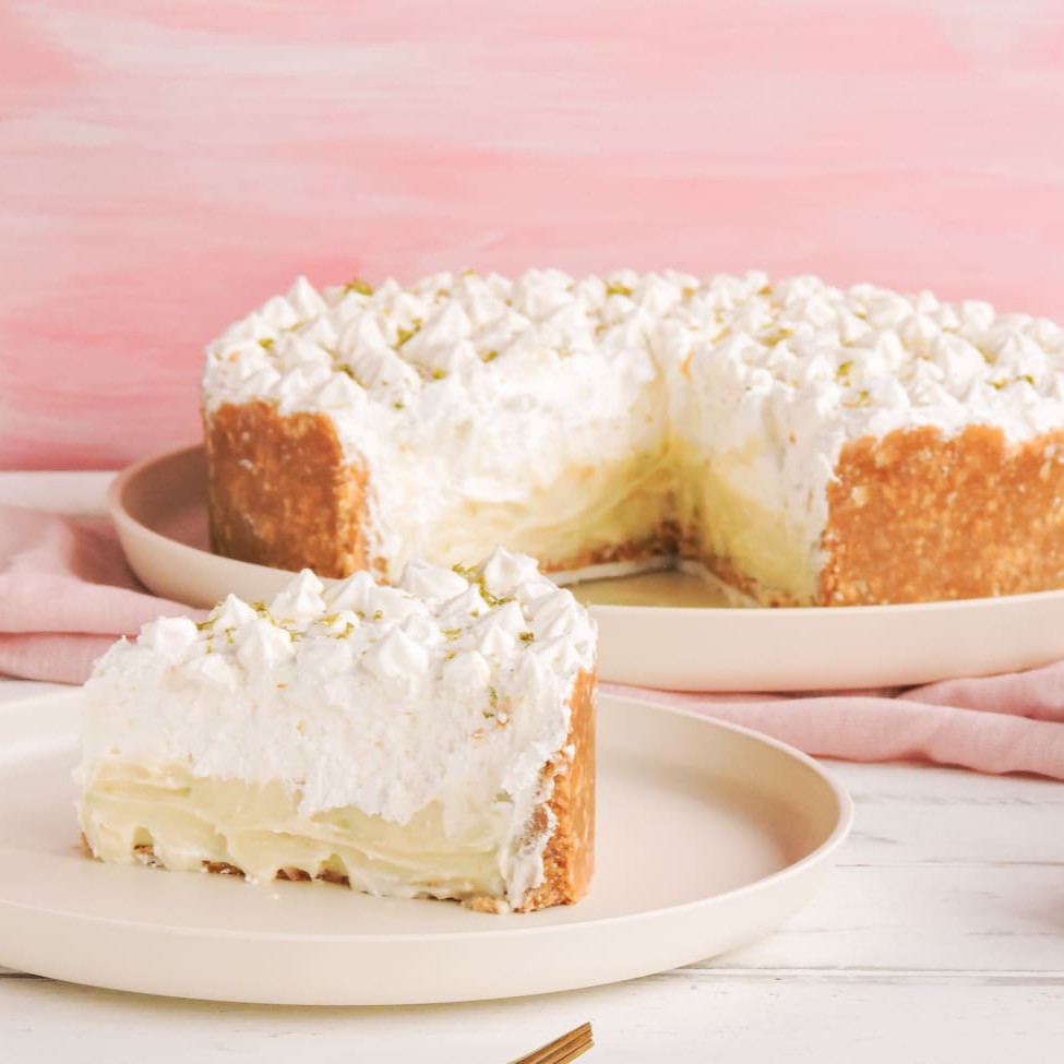 Torta feita com massa artesanal a base de bolacha maizena, creme trufado com chocolate branco nobre e limão, cobertura suave de chantilly e suspiros.