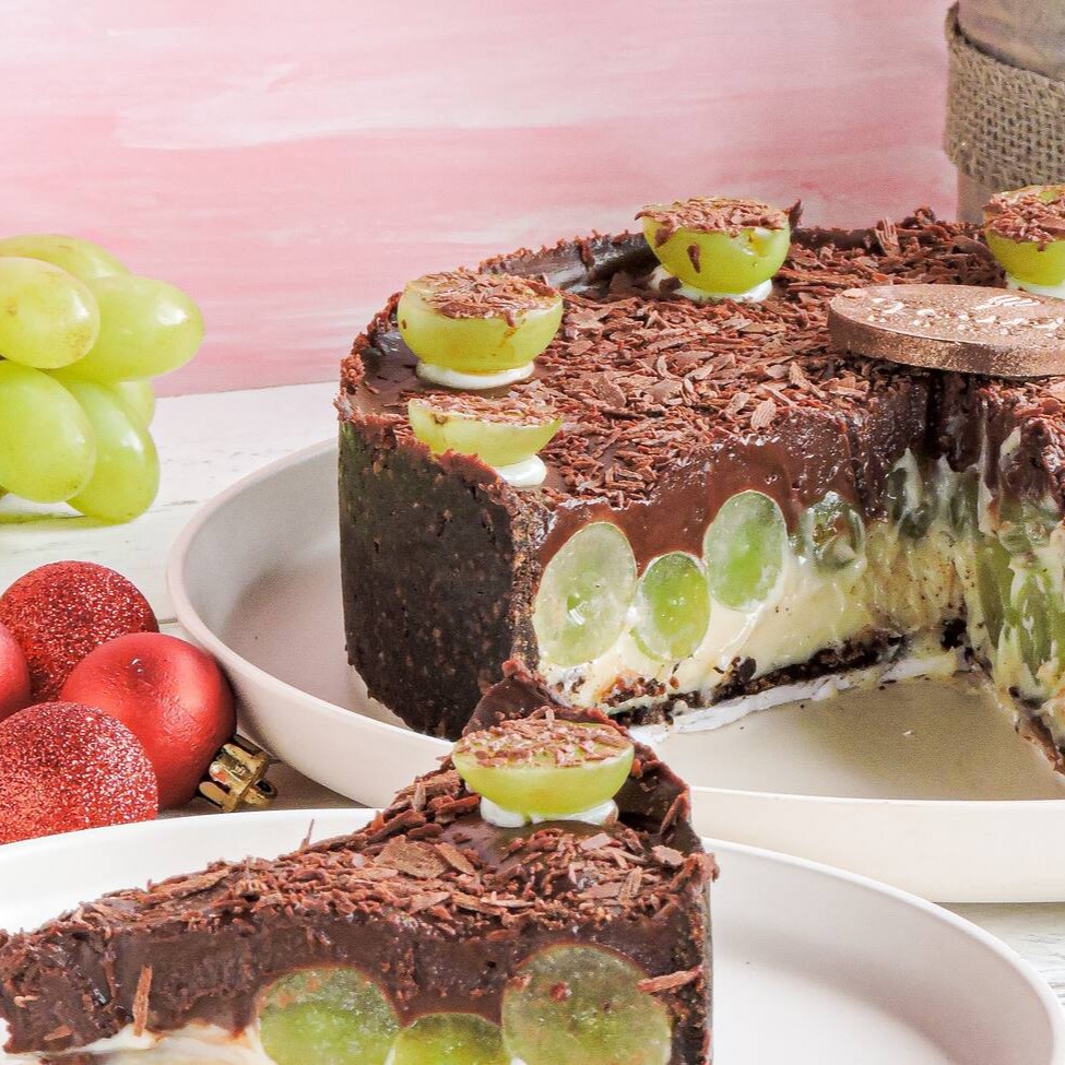 Torta Feita com Massa Negresco, creme branco cremoso com uvas selecionadas sem caroço e um creme ganache chocolate.