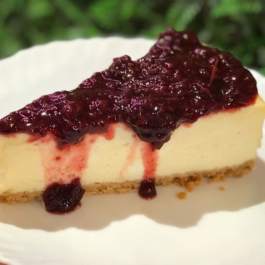 Cheesecake tradicional Americano com calda de frutas vermelhas