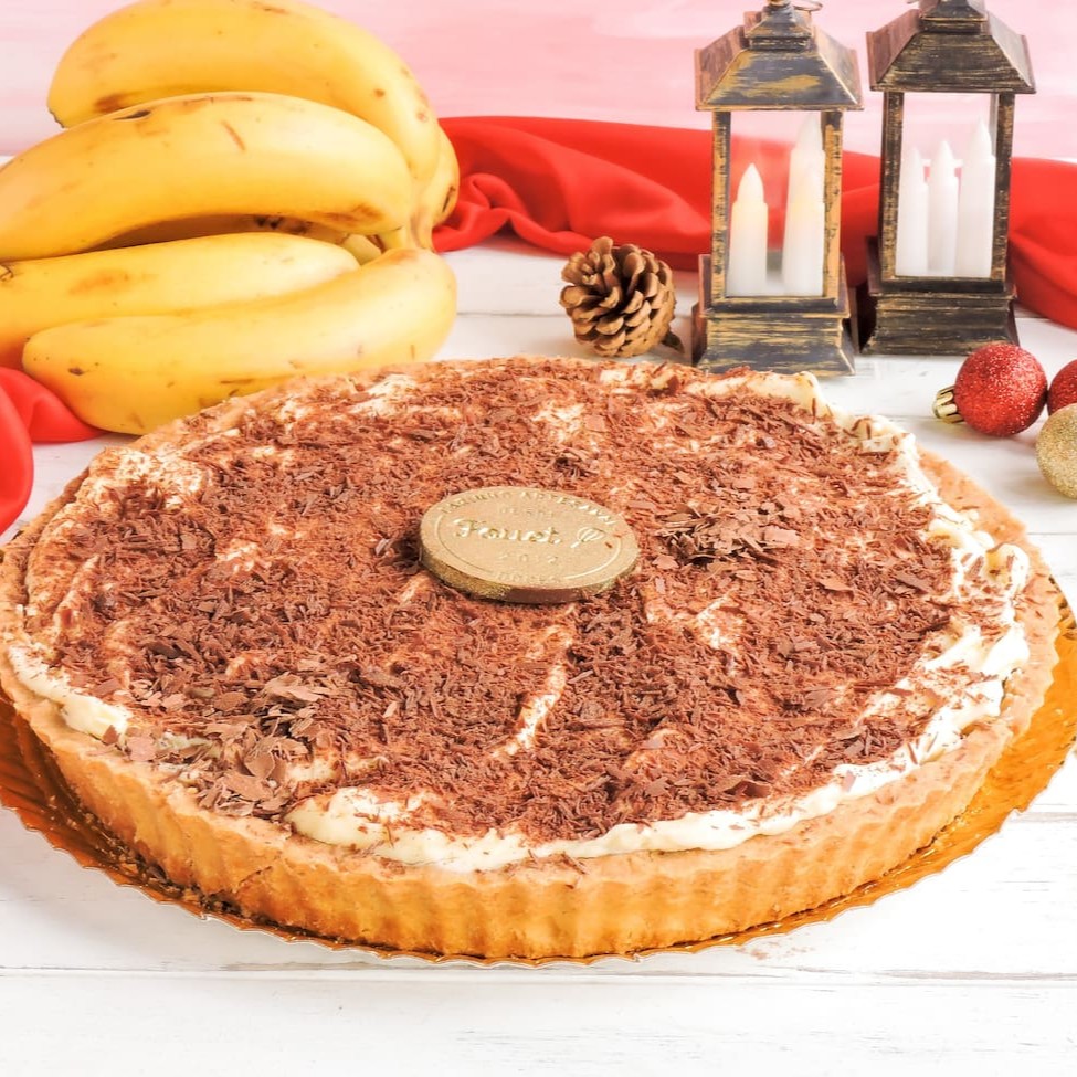 Banoffee tradicional torta Inglesa, massa artesanal, doce de leite cozido com bananaem rodelas, creme a base de chantily e raspas de chocolate Tamanho grande serve de 14 a 15 fatias
