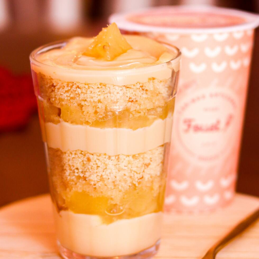 Massa de bolo branca intercalada com creme belga cremoso e pedaços de abacaxi em calda da casa, finalizado com creme e pedaços de abacaxi.