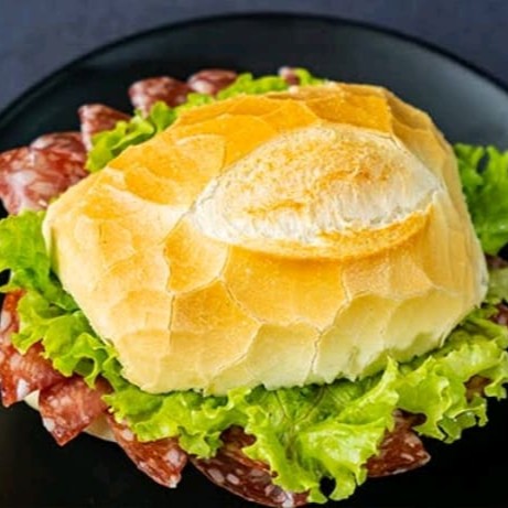 Um maravilhoso sanduíche de salame,tomate , alface, maionese,e mussarela tudo isso em um crocante e saboroso pão francês.