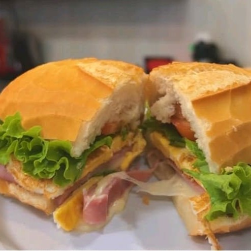 Um sanduíche composto com , presunto,mussarela,ovo, alface tomate, tudo isso em um saboroso pão francês.