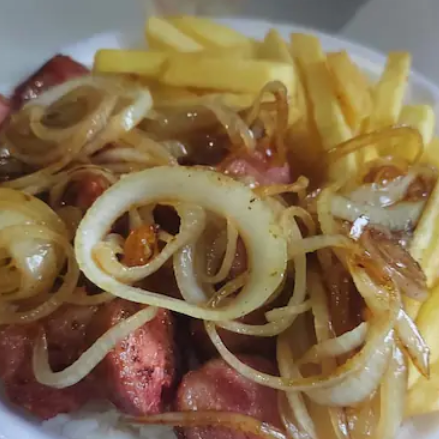 uma maravilhosa porcao calabresa acebolada com batata uma delicia