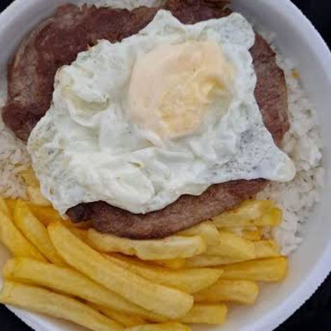 um maravilhoso bife com ovo e batata ,acompalhada com arroz,feijao