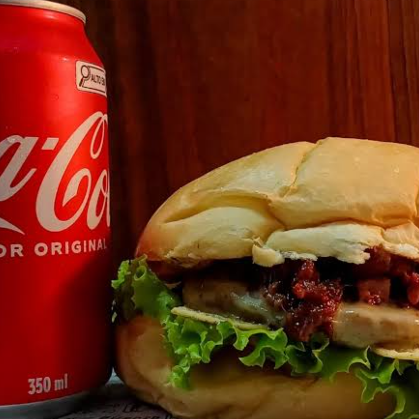 ACOMPANHADO DE ALFACE, TOMATE, HAMBURGUER, BACON UMA COCA GELADA