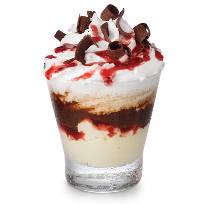 Delicioso Expresso, sorvete Fran's Gelato Fiori di Latte, calda de frutas vermelhas, rapas de chocolate e chantilly cremoso
