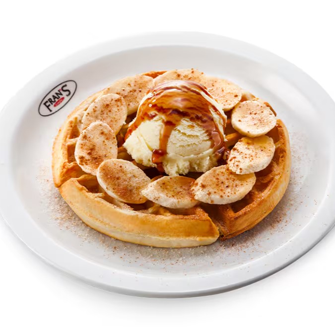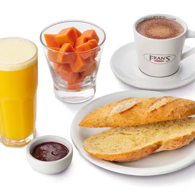 1 bebida grande, 1 suco de laranja, 1 Fran’s baguete ou baguete integral tostada com manteiga, 1 porção de mamão e 1 porção de geleia