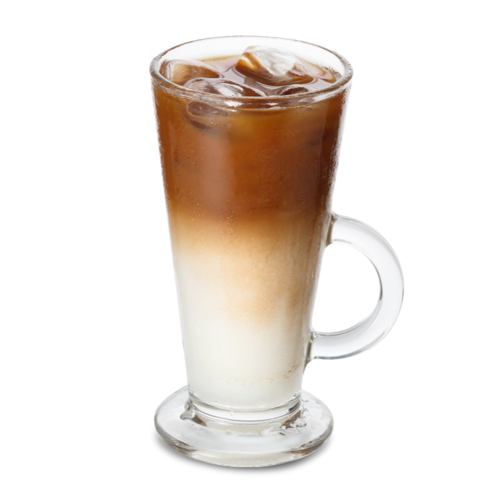 Espresso, leite, gelo e um toque de sabor de caramelo ou gengibre