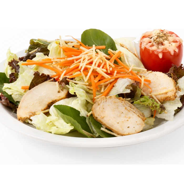 Alface americana, tiras de frango, queijo parmesão em lascas e croutons e molho caesar.