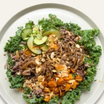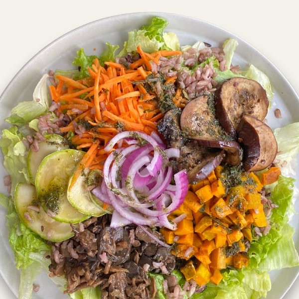 Mix de folhas, mix de grãos, 2 x mix cogumelos, abóbora assada, pepino, amêndoa laminada com molho oriental. Não alteramos itens deste prato.