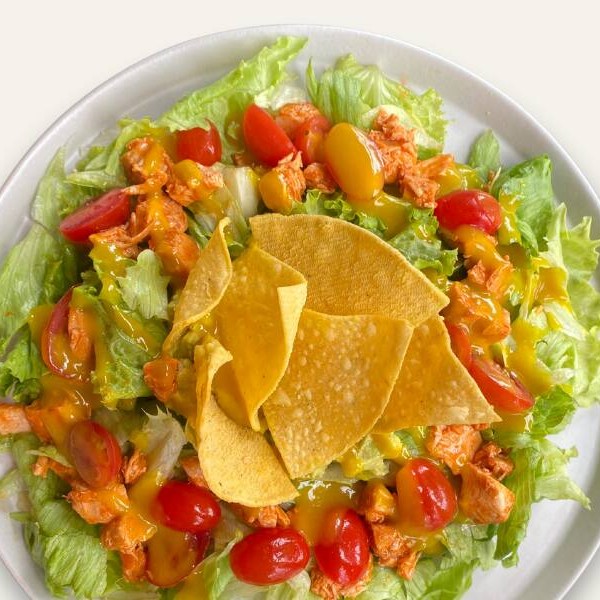 Mix de folhas, frango apimentado, guacamole, tomate cereja, tortilla de milho com vinagrete de limão siciliano. Não alteramos itens deste prato.
