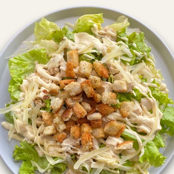Alface americana, 2 x frango em cubos, queijo parmesão, croutons com molho caesar. Não alteramos itens deste prato.