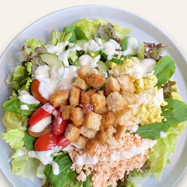 Alface americana, rúcula, salmão em lascas, ovo cozido, pepino, tomate cereja, croutons com molho ranch light. Não alteramos itens deste prato.