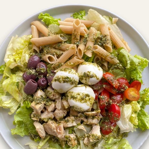 Mix de folhas, macarrão integral sem glúten, frango em cubos, mussarela de búfala, azeitona preta, tomate cereja com molho pesto.