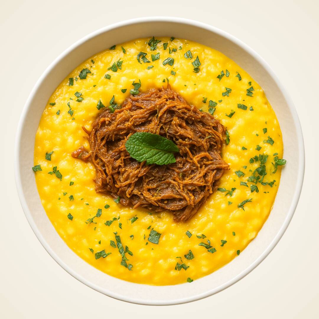 Cremoso risoto de abóbora combinado com ragu de carne bem saboroso.