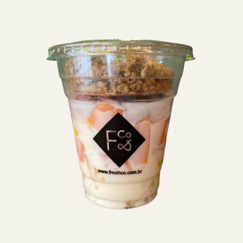 Mix de frutas da estação com iogurte natural e granola.
