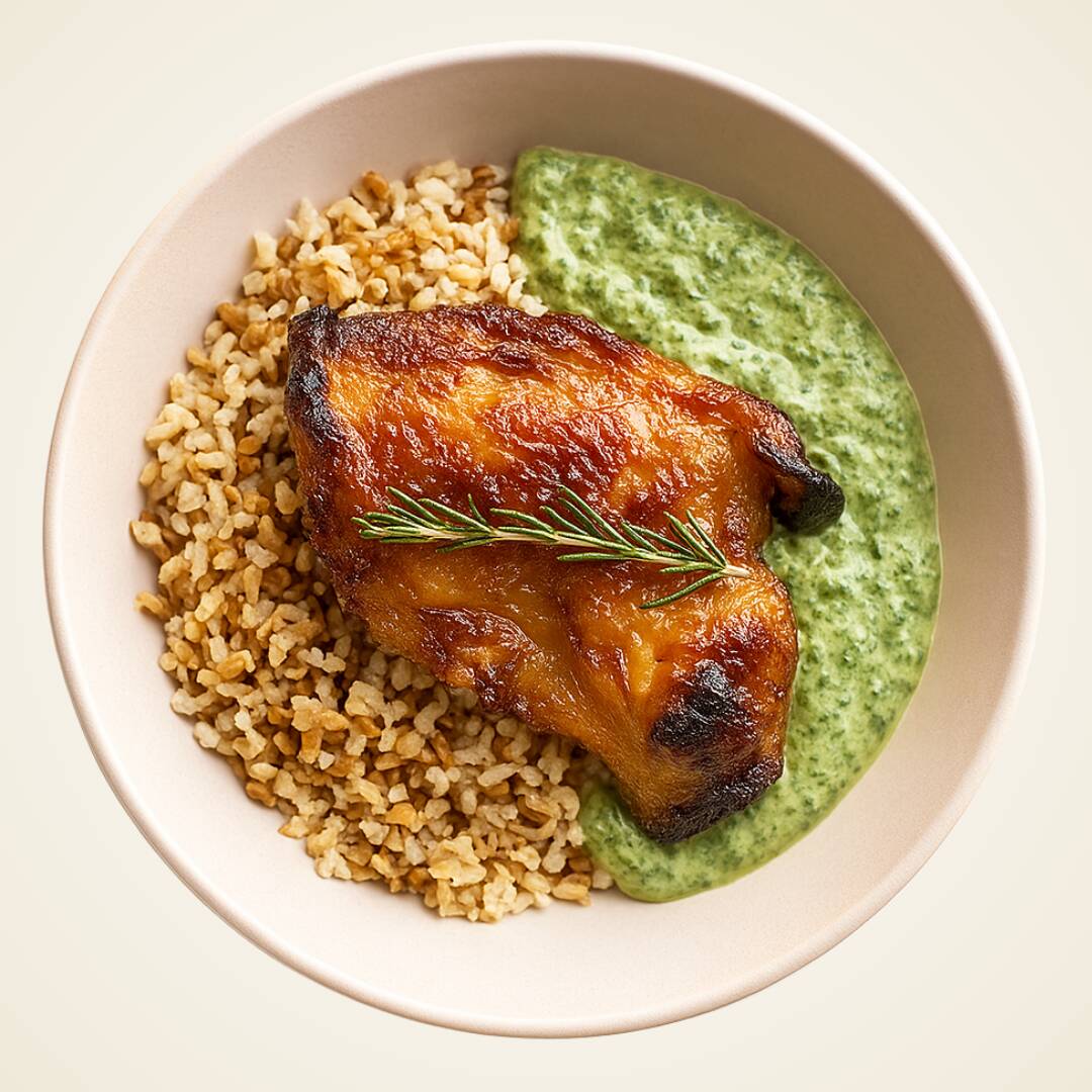 Sobrecoxa de frango dessosada, assada no molho mostarda e mel, com creme de espinafre e arroz 7 grãos. Aconchegante e cheio de sabor.
