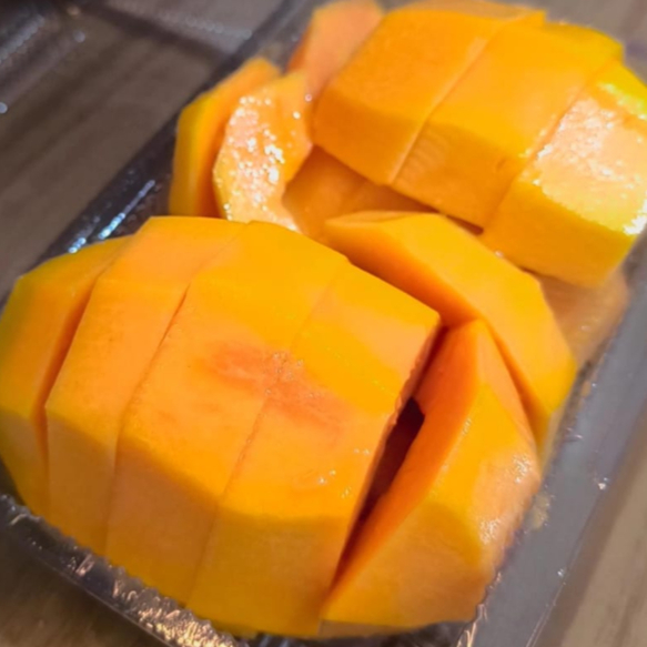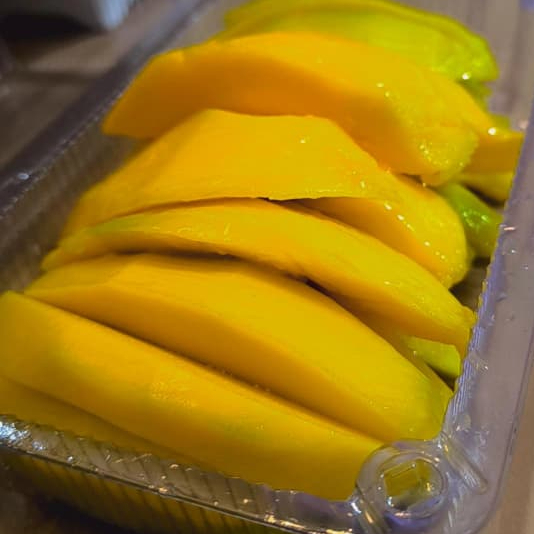 Delicie-se com a suculenta Manga Palmer cortada, pronta para consumo. Uma explosão de sabor tropical em sua boca!