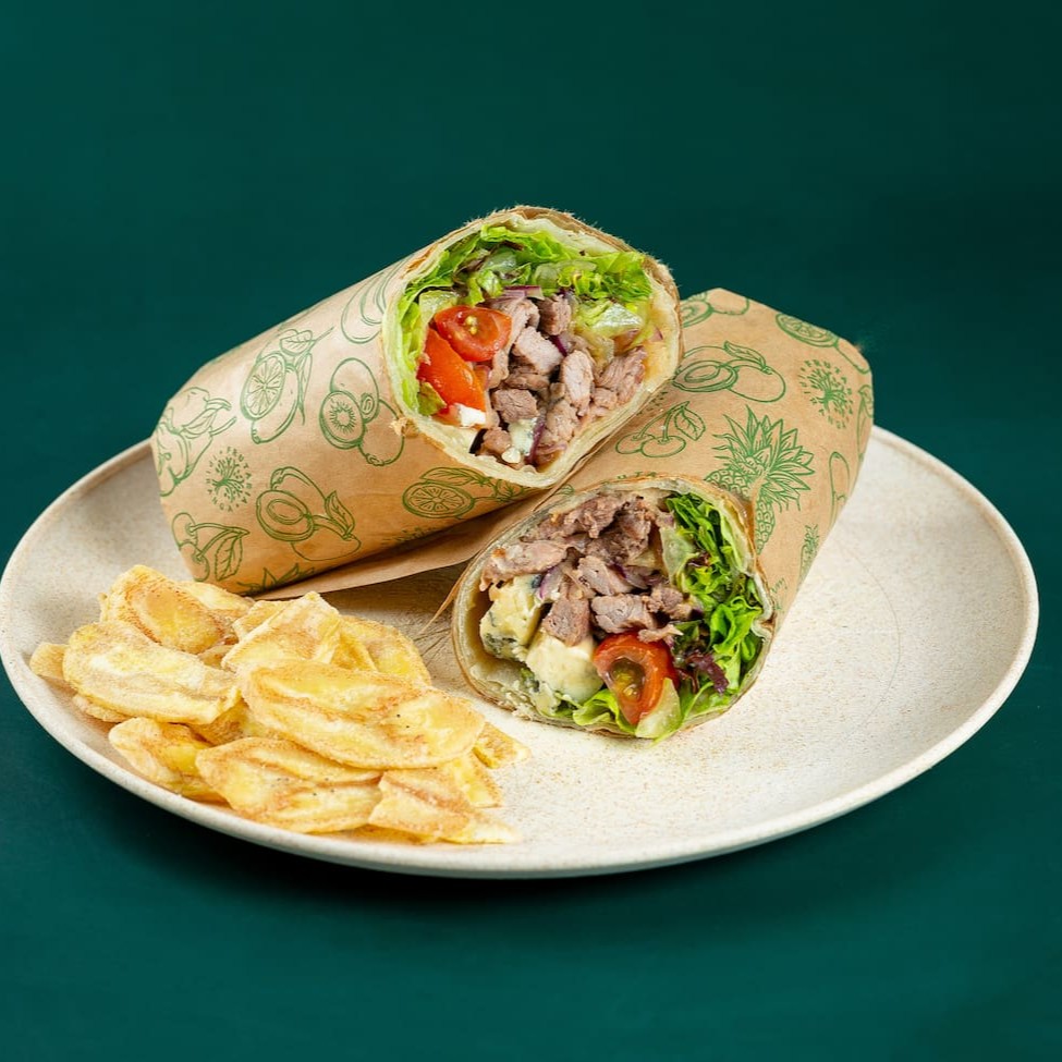 Um wrap de carne para os amantes de sabores intensos, com tiras de filé mignon, mix de folhas, cebola roxa, tomate-cereja, queijo gorgonzola derretido e um molho Frutaria Sauce sutilmente picante. Wrap prensado e acompanhado de crocantes chips bananas.