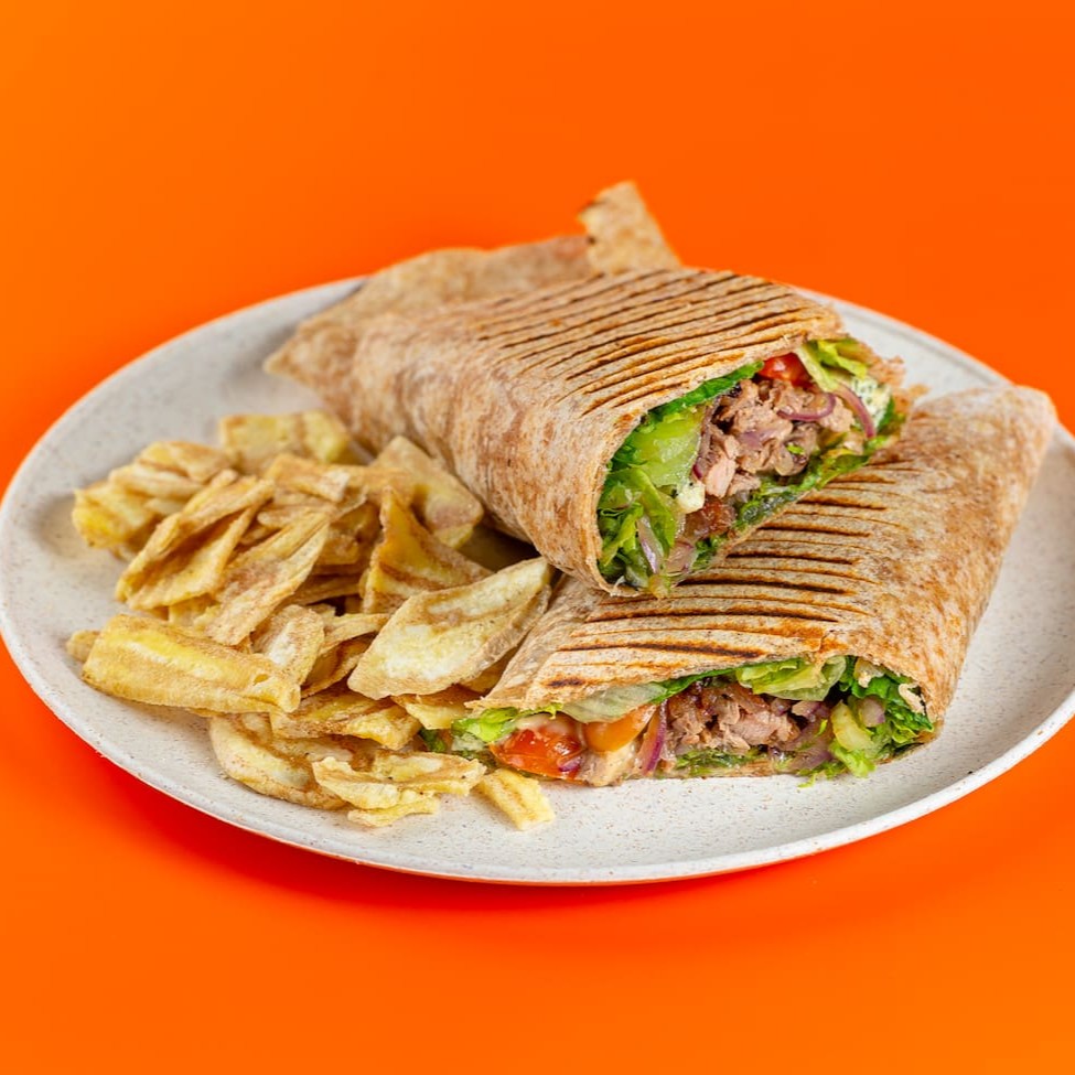 Um wrap de atum irresistível, com atum fresco, mix de folhas crocantes, muçarela de búfala derretida, tomate seco saboroso, azeitonas pretas e um molho Frutaria Sauce sutilmente picante. Wrap prensado e acompanhado de crocantes chips bananas.