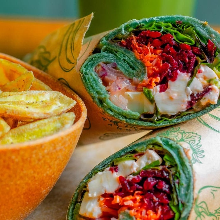 O wrap vegetariano mais saudável e saboroso, com uma mistura de folhas verdes frescas, cenoura e beterraba ralada, queijo minas, cebola roxa, tomate-cereja e o molho Frutaria Sauce sutilmente picante. Acompanhado de crocantes chips de banana.