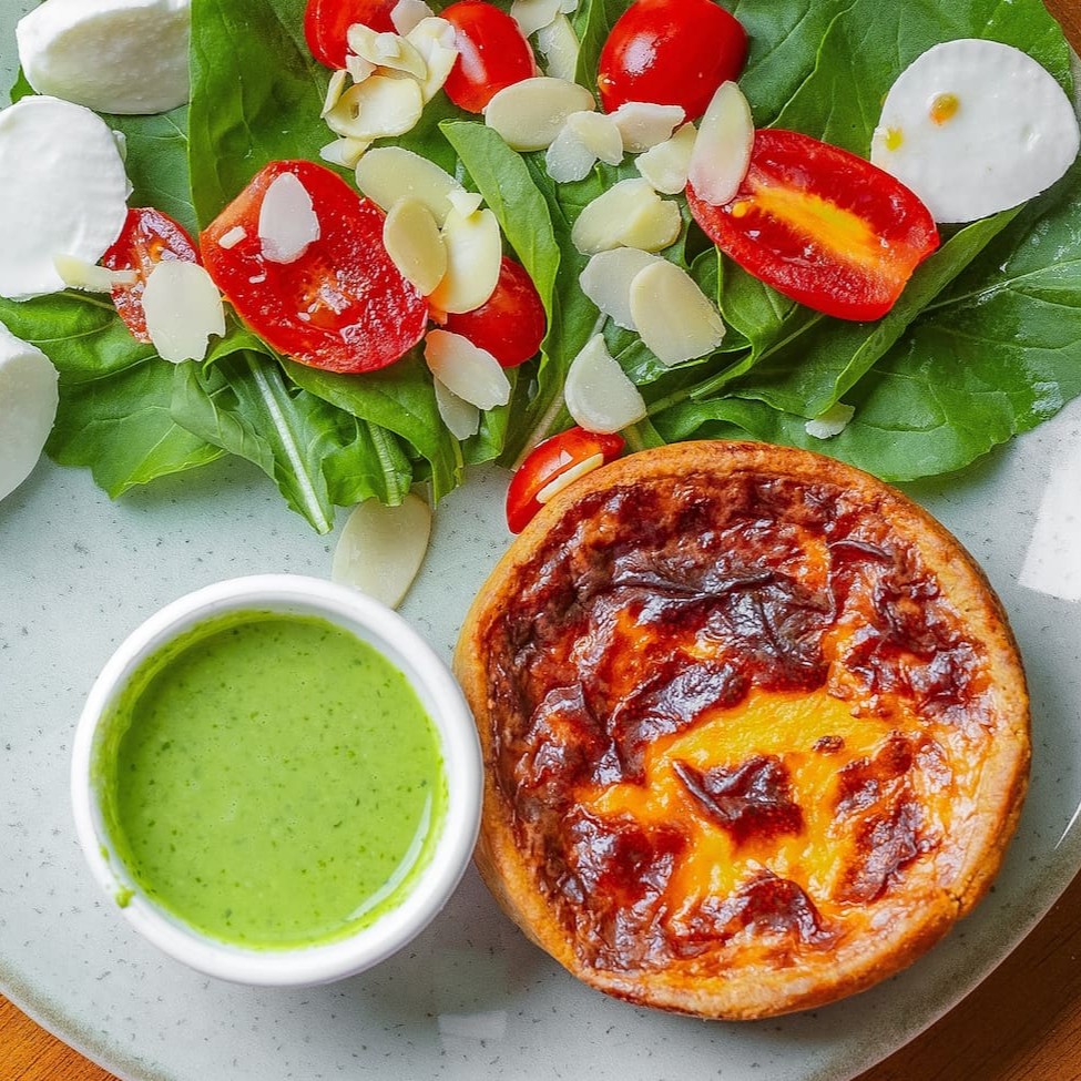 Quiche leve e integral com recheio cremoso de frango. Sabor e saúde em cada pedaço! Acompanha salada fresca com manjericão, rúcula, tomate cereja, muçarela de búfala, amêndoas laminadas e molho pesto.