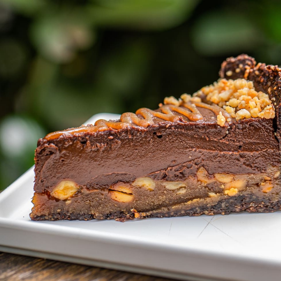 Deliciosa torta de caramelo de amendoim, açúcar de coco, batata doce, chocolate belga 54% e cacau. Vegana e sem glúten.