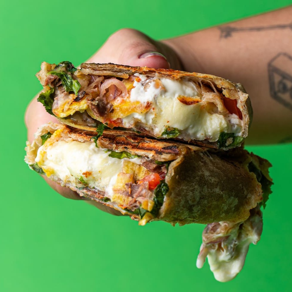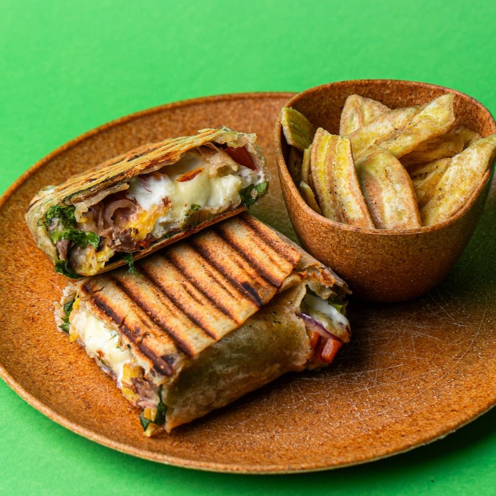 Um wrap de carne para os amantes de sabores intensos, com tiras de filé mignon, mix de folhas, cebola roxa, tomate-cereja, queijo gorgonzola derretido e um molho Frutaria Sauce sutilmente picante. Wrap prensado e acompanhado de crocantes chips bananas.