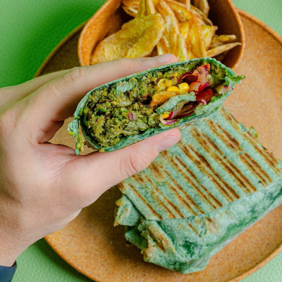 Um wrap vegano repleto de sabores, com mix de folhas, abacate, grão de bico cozido, cogumelos, tomate-cereja , castanha de caju crocante e molho vegano com uma mistura irresistível de mostarda, melado de cana e limão fresco. Com chips de banana.