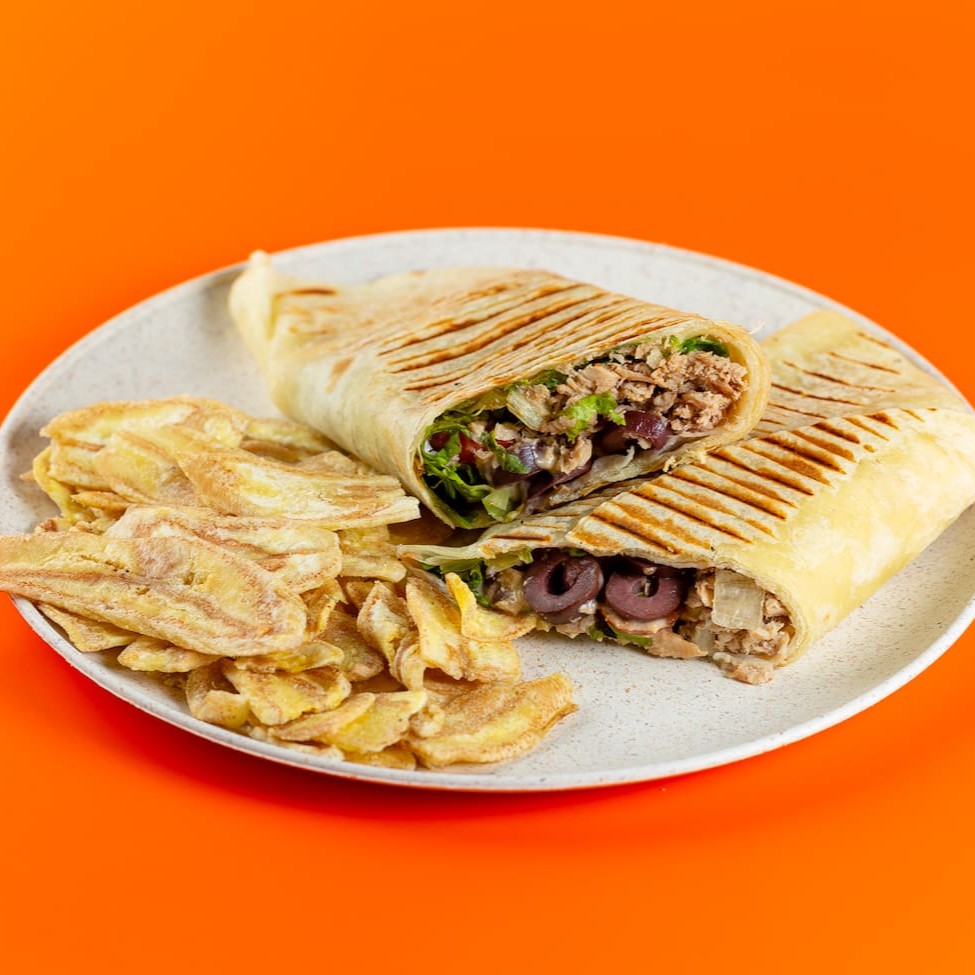 Um wrap de atum irresistível, com atum, mix de folhas crocantes, muçarela de búfala derretida, tomate seco saboroso, azeitonas pretas e um molho Frutaria Sauce sutilmente picante. Wrap prensado e acompanhado de crocantes chips bananas.
