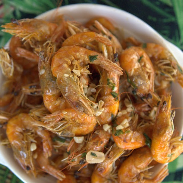 1 kg de camarão in natura, feito metade alho e óleo e metade ao bafo. Com casca e cabeça, Seu peso final pode variar até 30%