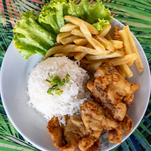Um delicioso peixe frito com arroz branco, fritas, pirão de peixe e feijão