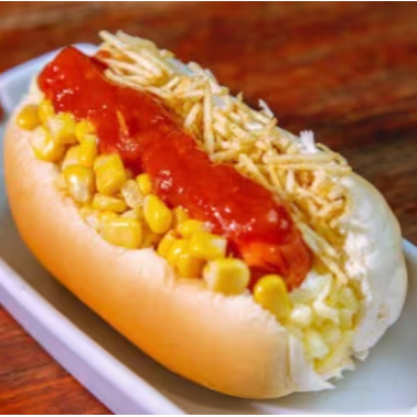 Duas salsichas Sadia, batata palha, salada, milho, purê, ketchup, mostarda, maionese, cheddar, Catupiry e queijo ralado serve 1 pessoa