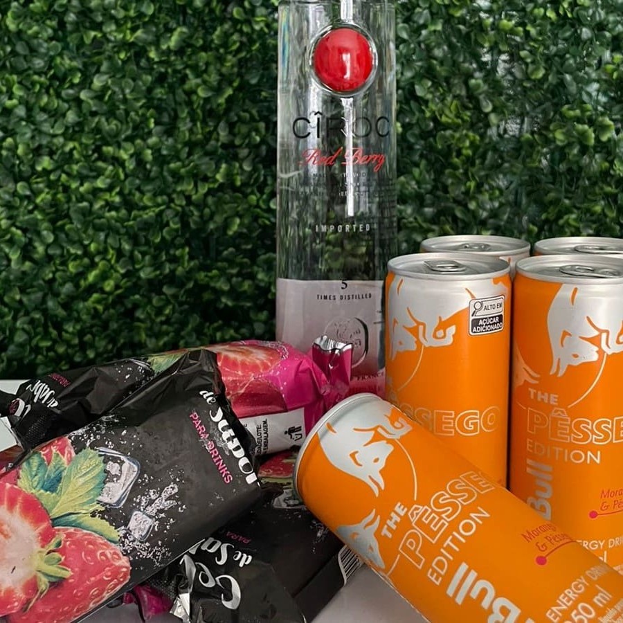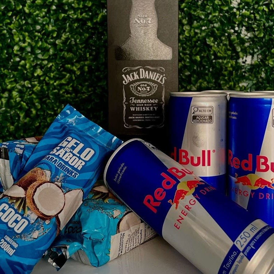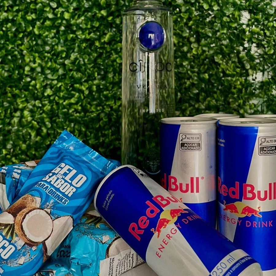5 Red Bull + 5 gelos + 5 copos + 5 canudos