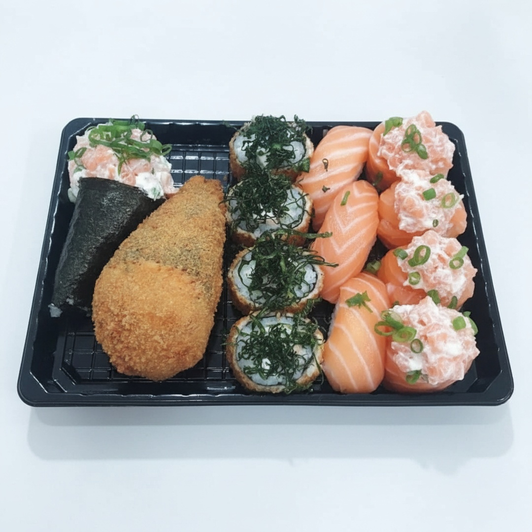 12 Hot Rolls, 4 Uramaki De Salmão Grelhado, 4 Sushi Cru, 4 Uramaki De Salmão Cru, 2 Nigiri De Tilapia Crua, 2 Nigiri De Atum, 2 Nigiri De Salmão Cru, 2 Nigiri De Salmão Flambado E 2 Nigiri De Tilapia Flambada.