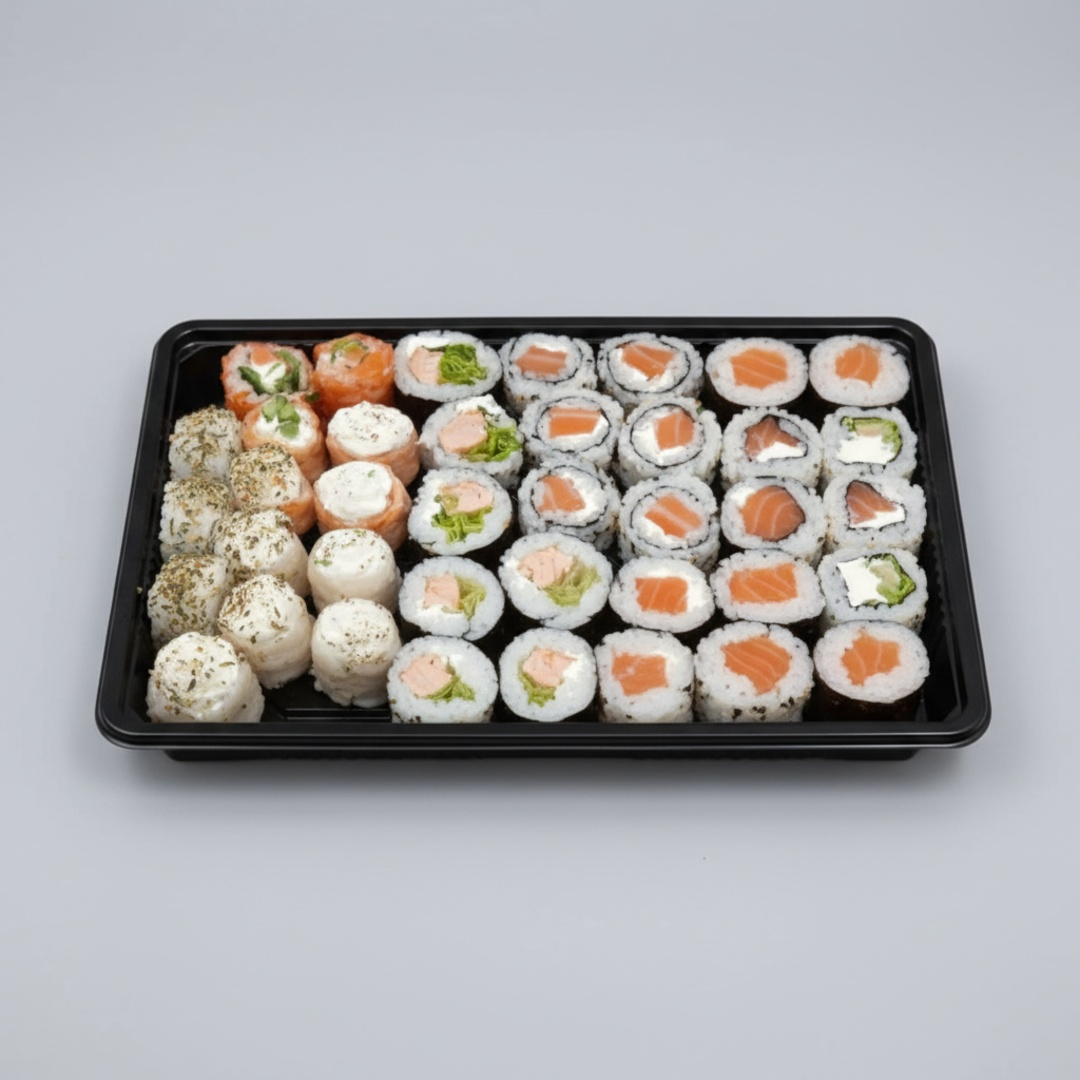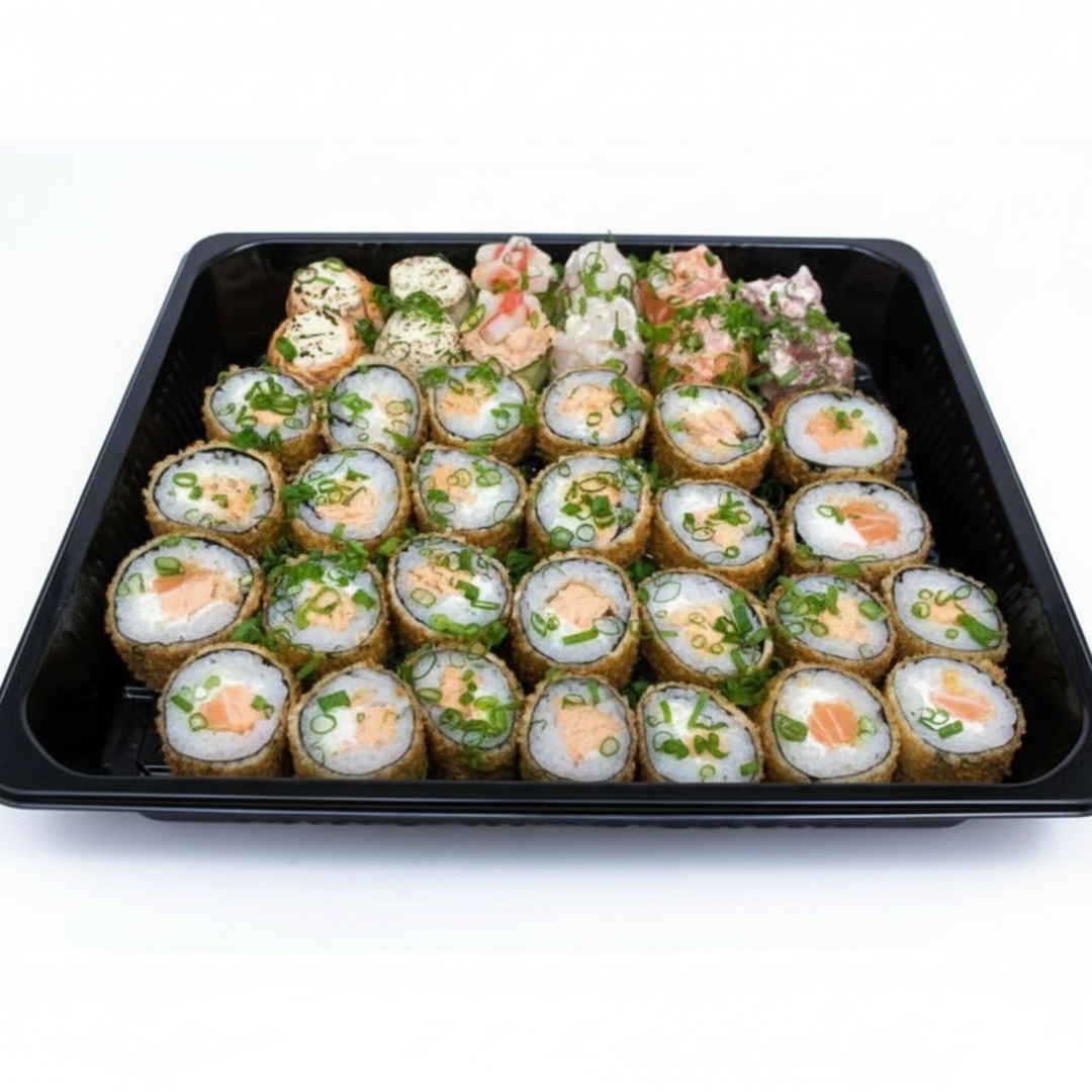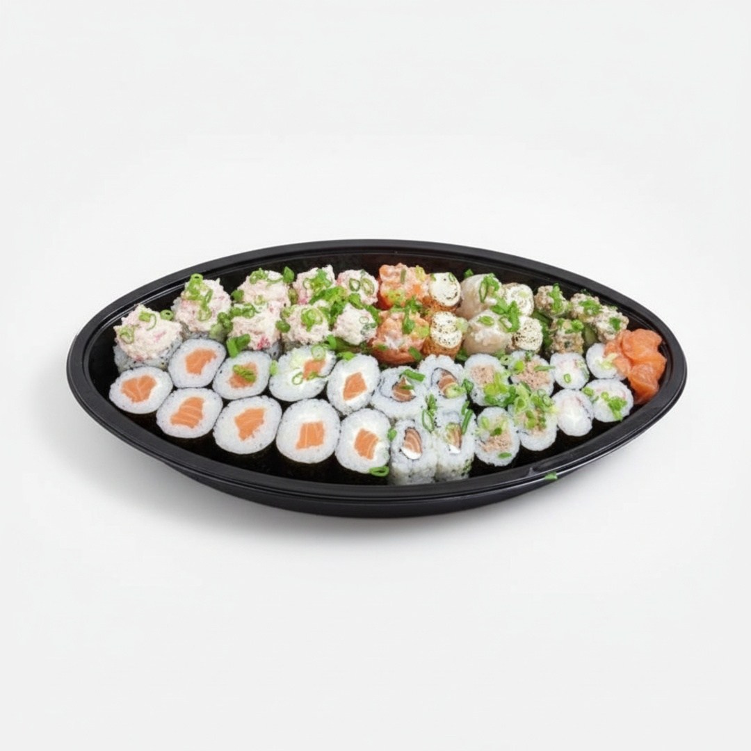 12 Hot Rolls, 4 Uramaki De Salmão Grelhado, 4 Sushi Cru, 4 Uramaki De Salmão Cru, 2 Joe De Tilapia Crua, 2 Joe De Salmão Cru, 2 Nigiri De Atum, 10 Sashimis De Salmão E 10 Sashimis Misto.
