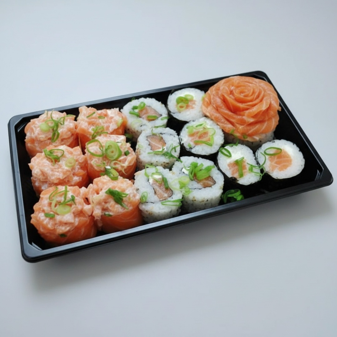 10 Sashimis De Salmão, 6 Joe De Salmão Cru, 4 Uramaki E 4 Sushi De Salmão Cru.