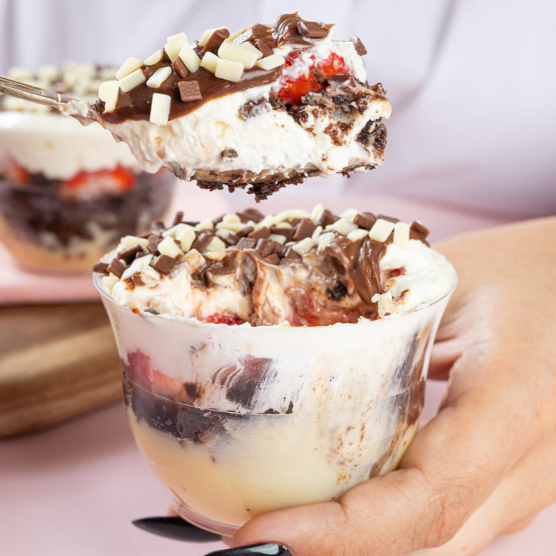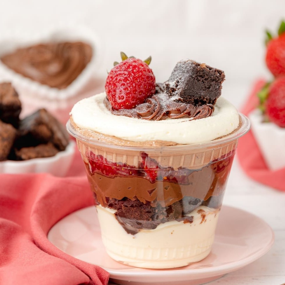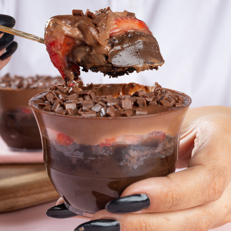 Deliciosas camadas de brigadeiro trufado feito com chocolate nobre meio amargo, intercaladas com pedaços do nosso brownie chocolatudo, morangos selecionados e um brigadeiro gourmet branco. Finalizado com granulado de chocolate.