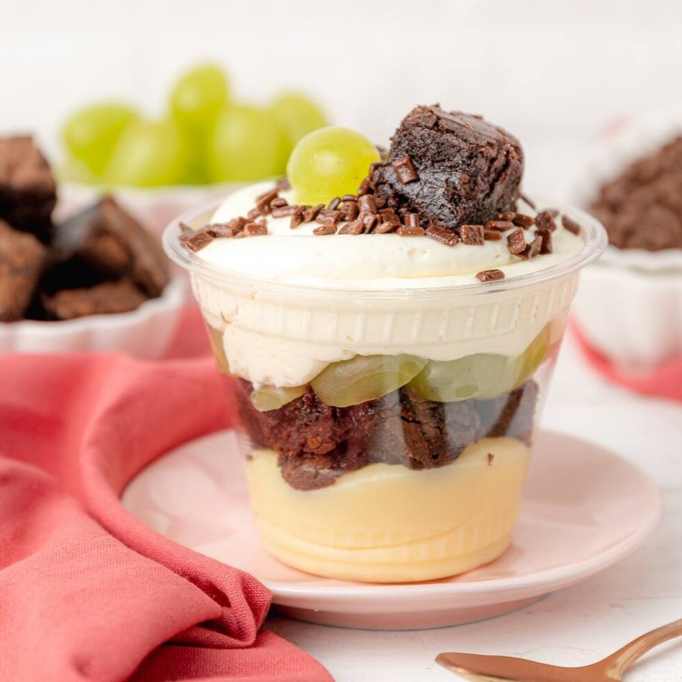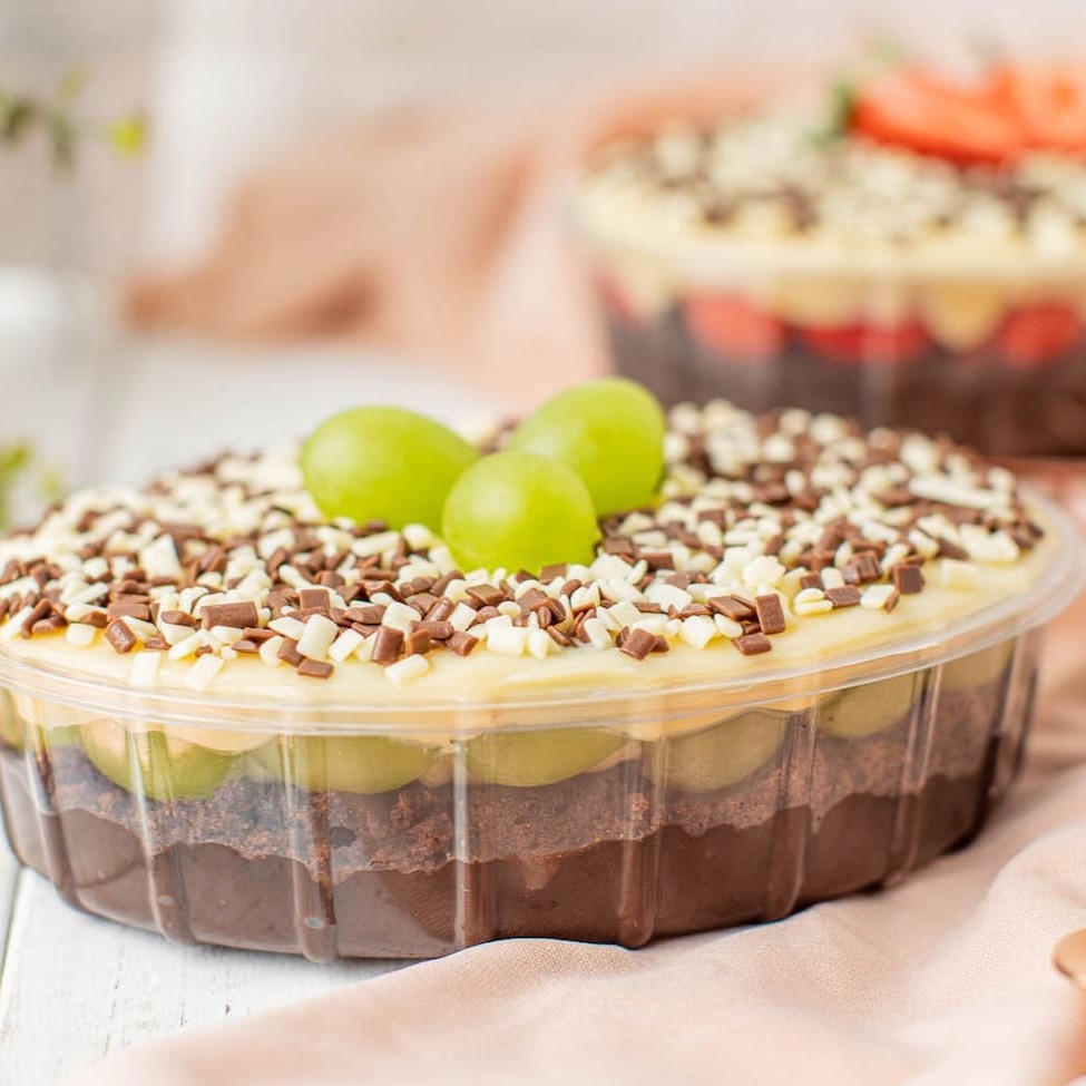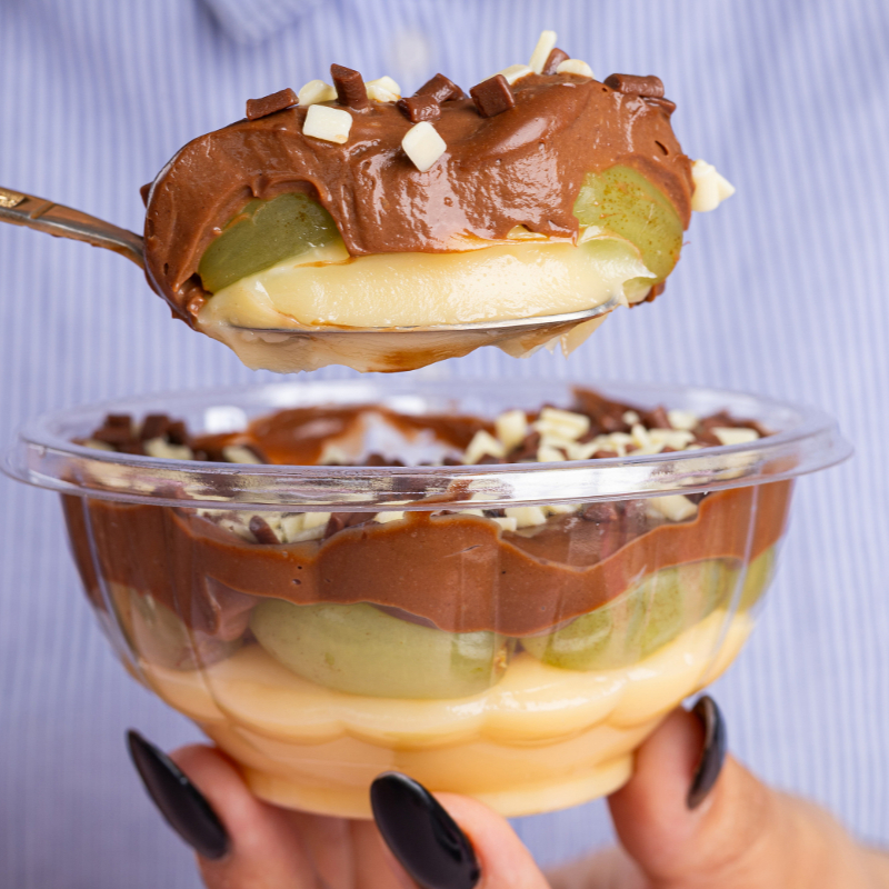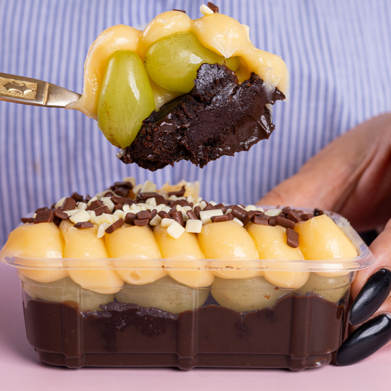 Deliciosas camadas de Brigadeiro gourmet branco cremoso, pedaços do nosso famoso brownie chocolatudo, uvas verdes sem semente e Creme Ninho. 290g