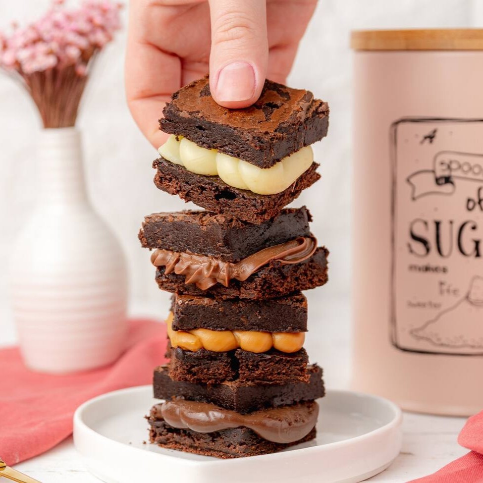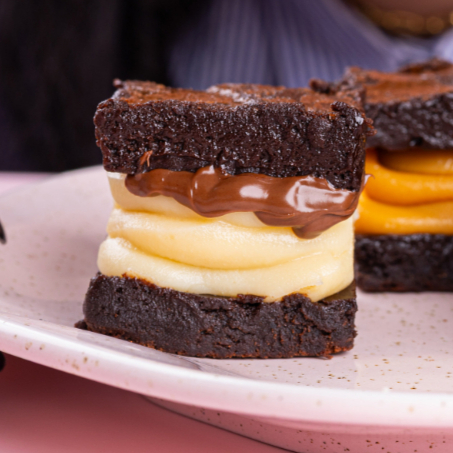 Brownie perfeito, super cremoso e chocolatudo, feito a base de chocolate nobre meio amargo. E pra melhorar com o seu recheio favorito, Ninho com Nutella Original.