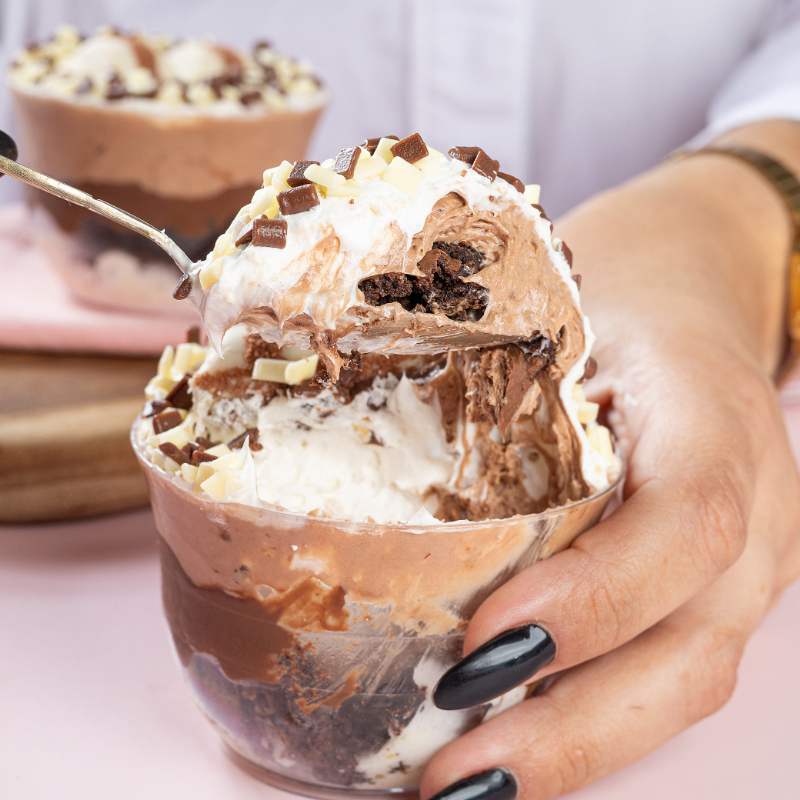 Deliciosas camadas de creme Kinder (receita exclusiva desenvolvida por nós), pedaços de brownie chocolatudo, Nutella pura e mousse de Nutella. Finalizado com Nutella, Kinder Bueno e granulado de chocolate branco e ao leite.